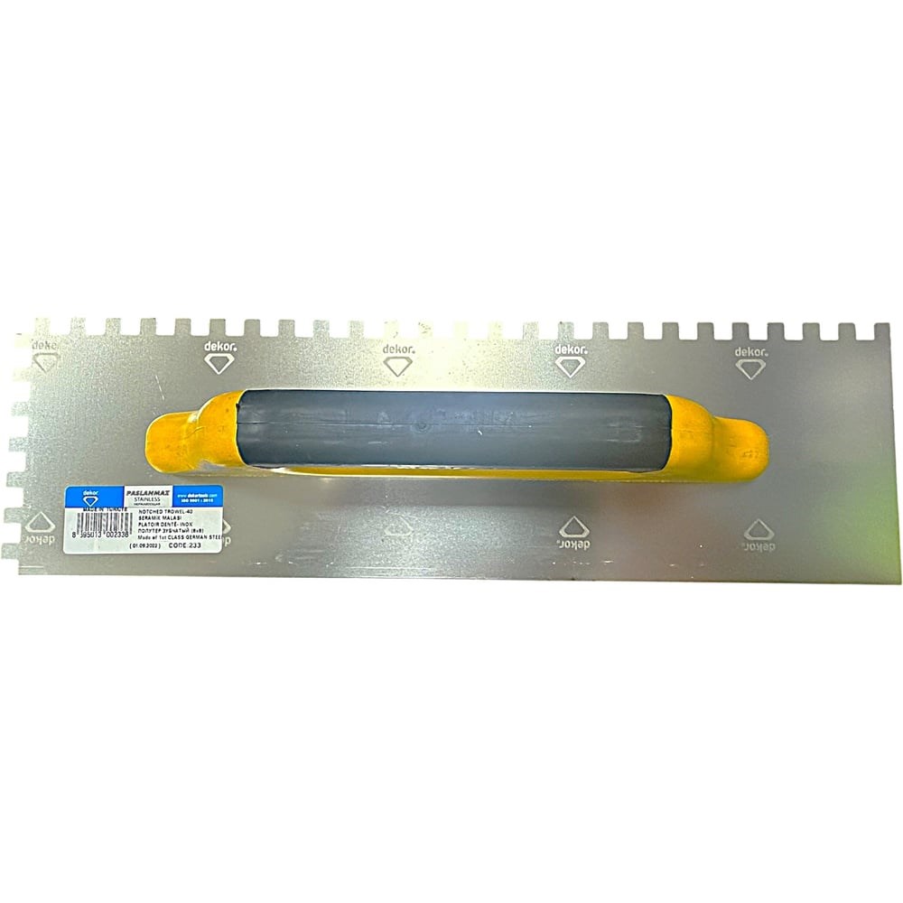 Зубчатый полутёр из нержавеющей стали DEKOR HASSAN 120*400мм 233, квадратные зубья 8*8мм, имеет увеличенную жесткость за счет двухстороннего крепления рукояти. Это позволяет равномерно распределять состав без утолщений и ровнее укладывать плитку. Нержавеющая сталь устойчива к воздействию химикатов в клеевых составах, что обеспечивает длительный срок службы даже при активной эксплуатации.