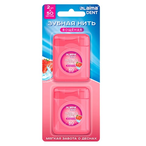Зубная нить вощеная 100 м (2 шт. х 50 м), мягкая забота о деснах, ВКУС КЛУБНИКИ, LAIMA DENT, 609416