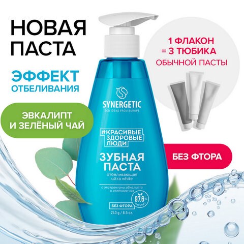Зубная паста 240 мл, SYNERGETIC "Отбеливающая", с экстрактами эвкалипта и зеленого чая, дозатор, 201023