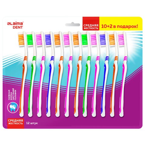 Зубная щетка средней жесткости, КОМПЛЕКТ 12 шт. (10 + 2 в подарок), LAIMA DENT, 609689