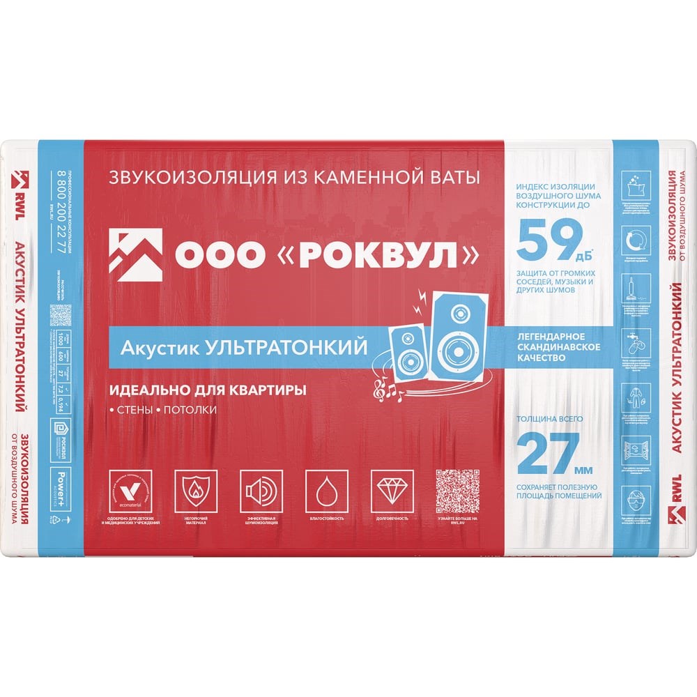 Звукопоглощающая плита RWL АКУСТИК БАТТС Ультратонкий 27 мм 236227 - это самое тонкое акустическое решение из каменной ваты, толщиной всего 27 мм, идеально подходит для использования в системах на основе профиля шириной 27 мм. Эти звукопоглощающие плиты применяются как дополнительная звукоизоляция стен и потолка от воздушного шума. Материал абсолютно экологичный, может использоваться для детских комнат и медицинских учреждений. Ультратонкие плиты из негорючей каменной ваты обеспечивают не только защиту от посторонних шумов, пожаробезопасность, но и теплоизоляцию. RWL Акустик УЛЬТРАТОНКИЙ - это оптимальное соотношение плотности и высоких звукопоглощающих свойств при незначительной толщине материала. Эффективность работы конструкции сопоставима с традиционной конструкцией со звукопоглощающим наполнением почти в два раза большей толщины - 50 мм. Дополнительные технические характеристики: Теплопроводность λ10 = 0,035 Вт/(м·К) Теплопроводность λD = 0.035 Вт/(м·К) Теплопроводность λА = 0.038 Вт/(м·К) Теплопроводность λБ = 0.040 Вт/(м·К) Водопоглощение при кратковременном и частичном погружении, не более 1,0 кг/м² Коэффициент паропроницаемости, 0,3 мг/м*ч*Па Плотность 60±10% кг/м³