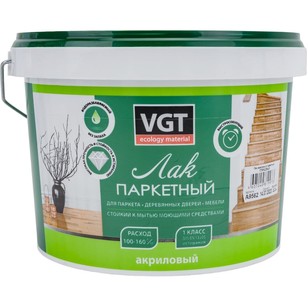 Акриловый лак VGT для паркета и дерева внутри помещений, глянцевый 2,2 кг 11602208 способен придать обновленный внешний вид деревянным поверхностям. Состав подходит для обработки мебели, дверей и паркета. Продукт создает покрытие, которое не подвержено негативному воздействию чистящих веществ и имеет длительный срок службы.