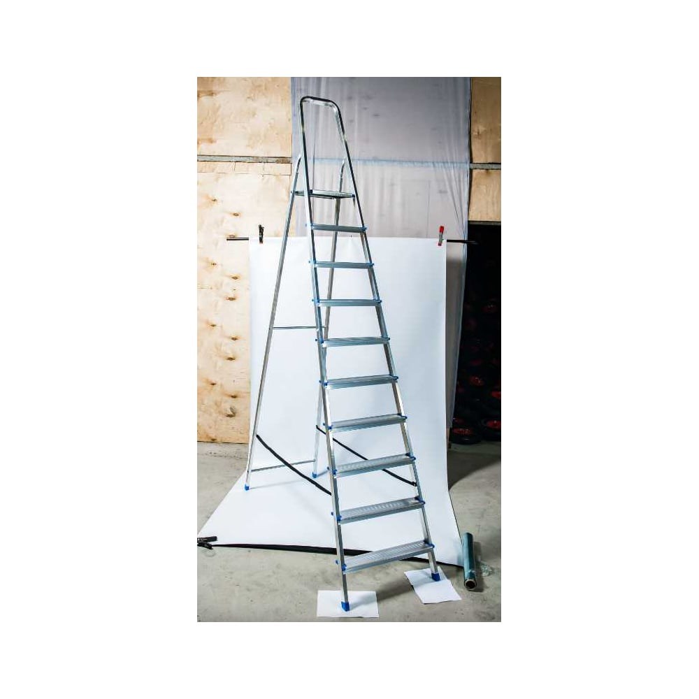 Стремянка подходит для работ как в помещении, так и на улице. Она изготовлена из высококачественного алюминиевого профиля. Конструкция снабжена широкой плоскостью и ступенями с рифлеными поверхностями, предотвращающими случайное скольжение. На ножках предусмотрены специальные пластиковые заглушки, защищающие напольное покрытие от повреждений. Стремянка способна выдержать вес до 150 кг. Она позволяет совершать работы на высоте и комфортно размещает до 2-ух человек.