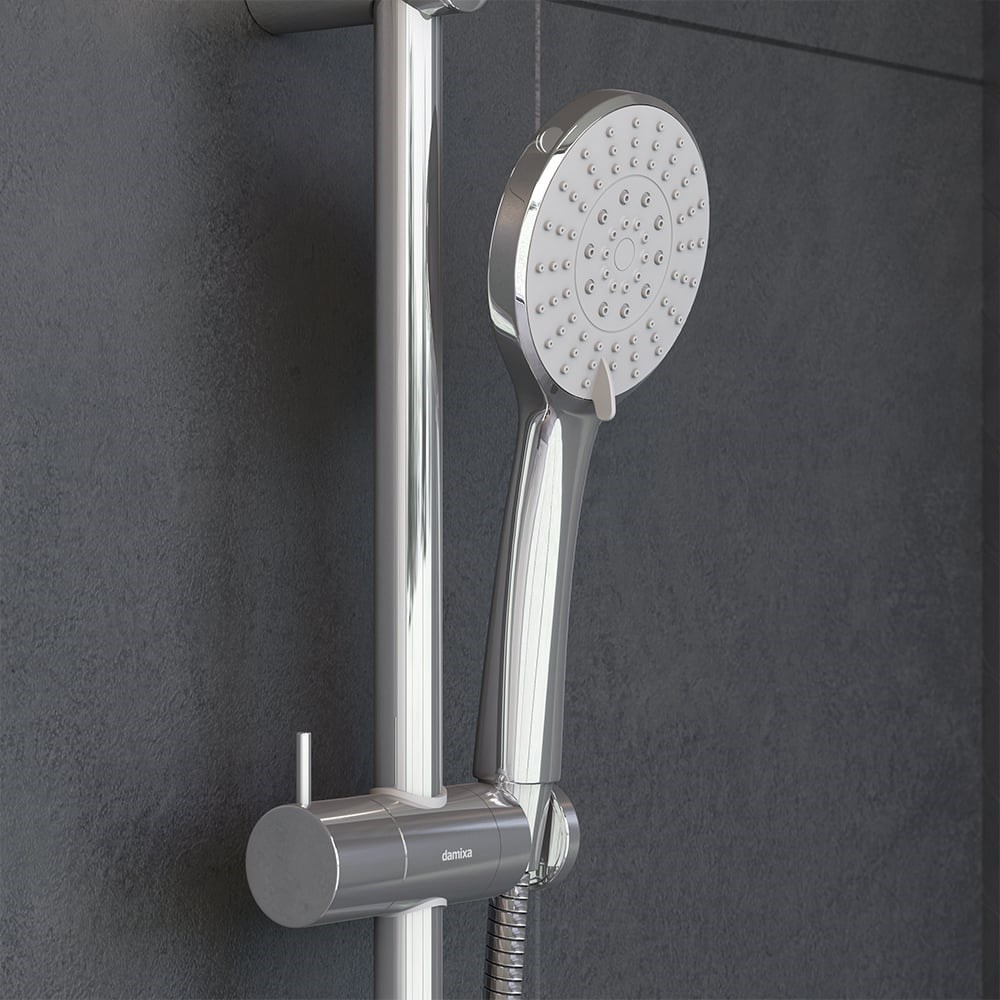 Простота линий и элегантность форм душевой системы идеально впишется в ванную комнату как классического дизайна, так и ультрасовременного. Отличительной чертой душевой системы является штанга с креплениями Vario. Ее длина составляет 700 мм, что облегчает ее установку, а крепления позволяют установить душ на комфортной высоте. Наиболее оптимальный диаметр лейки в 120 мм обеспечит комфорт от принятия душа при сохранении высокой функциональности - 5 режимов душа. В душевую систему встроена круглая полочка с бортами для хранения средств для ухода.