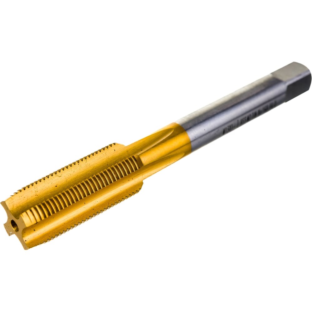 Метчик M13x1 HSS M2 TiN прямой компл. ПрофОснастка №168 арт. 50311038 выполнен по ISO 529, правый, точность 6H, предназначен для сквозных и глухих отверстий. Прямая канавка обеспечивает легкий отвод стружки при обязательном использовании СОЖ. Ресурс использования на любых металлах многократно увеличивается при использовании СОЖ. Покрытие нитрида титана увеличивает поверхностную твердость и износостойкость, а также обеспечивает повышенный ресурс. Также благодаря покрытию метчик может ограниченно использоваться на нержавеющих сталях. Общая длина метчика 89 мм, длина режущей части 29 мм, диаметр хвостовика 9 мм, посадочный квадрат 7,1 мм.