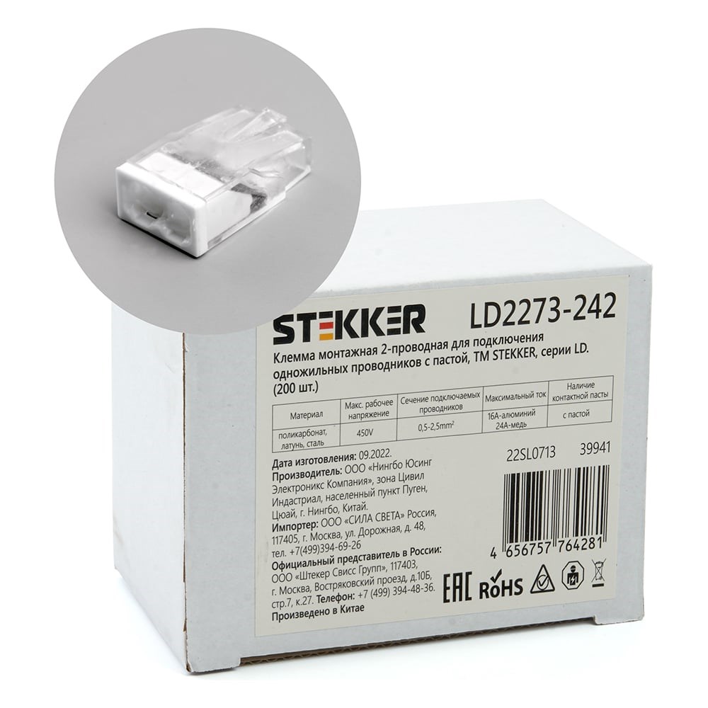Монтажная 2-проводная клемма STEKKER с пастой для 1-жильного проводника, ld2273-242, 39941
