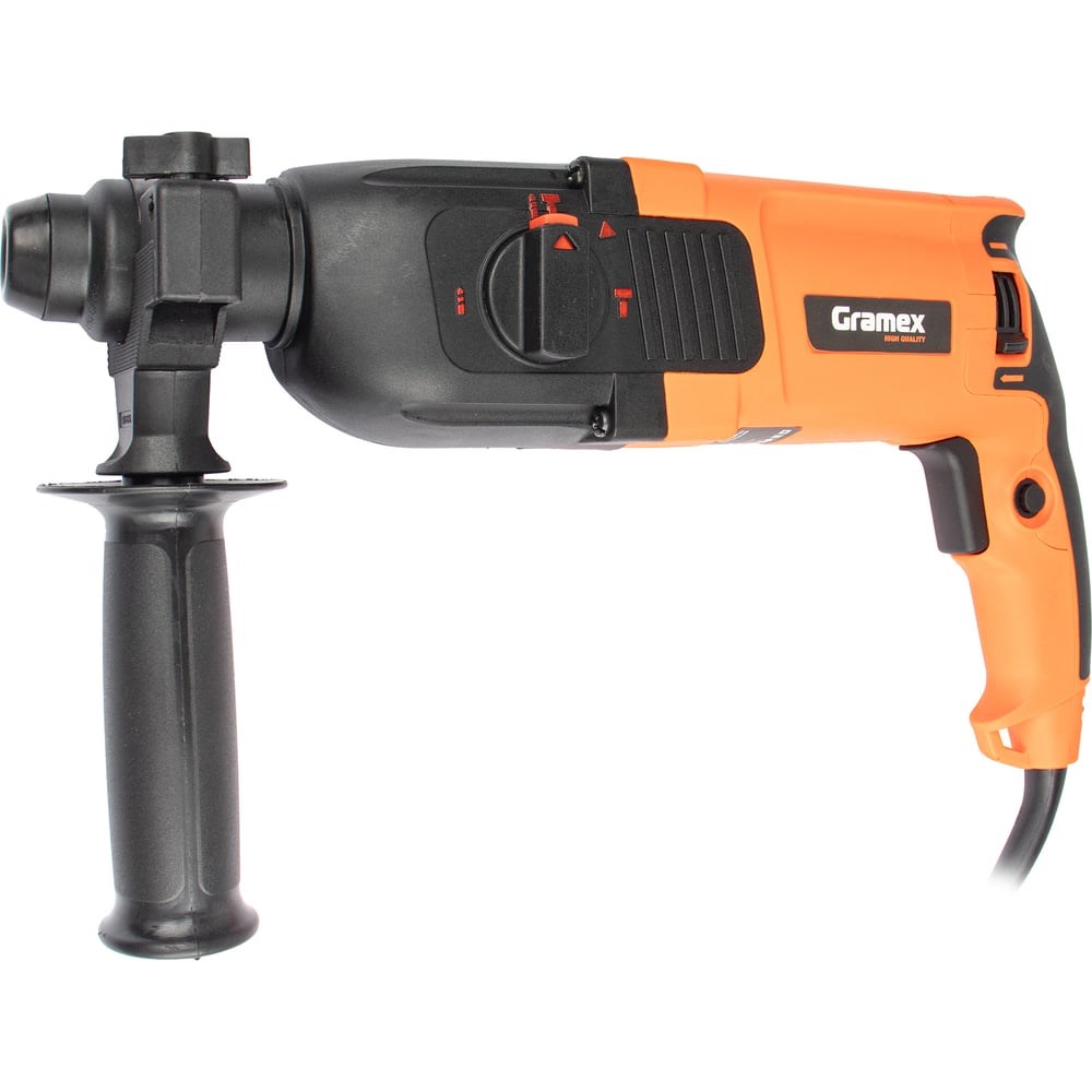 Перфоратор электрический Gramex HRH-1100 (1100Вт, 0-1400об/мин, 0-5500уд/мин, 4,0Дж, 3 режима, SDS+)Перфоратор Gramex HRH-1100 — это мощный и надежный инструмент, предназначенный для выполнения сложных задач по созданию отверстий в твердых материалах, таких как кирпич, камень, бетон и металл.Ключевые особенности:Мощность двигателя: 1100 Вт — гарантирует высокий крутящий момент и производительность даже при больших нагрузках.Энергия удара: 4 Дж — обеспечивает отличное проникновение в строительный материал.Частота вращения вала: 0-1400 об/мин — широкие пределы регулирования позволяют адаптироваться к любому типу материала.Режимы работы: три режима (простое сверление, сверление с ударом).Патрон: стандарт SDS+, совместимый с большинством современных инструментов и оснастки.Кабель длиной 2 метра: Обеспечивает необходимую длину для удобства работы и минимизирует вероятность повреждений.Компактность и прочность: Вес 2,98 кг и горизонтальное расположение двигателя делают инструмент маневренным и простым в управлении.Диаметры сверления: Древесина — до 40 мм, металл — до 13 мм, бетон — до 32 мм.Реверсивный режим.Предохранительная муфта: Повышает безопасность работы, защищая инструмент от поломок при заклинивании сверла.Кейс в комплекте: Специальный кейс обеспечивает сохранность и удобство перевозки инструмента.Перфоратор Gramex HRH-1100 подходит как для начинающих мастеров, так и опытных профессионалов, работающих в строительстве, отделке помещений и реставрации зданий.