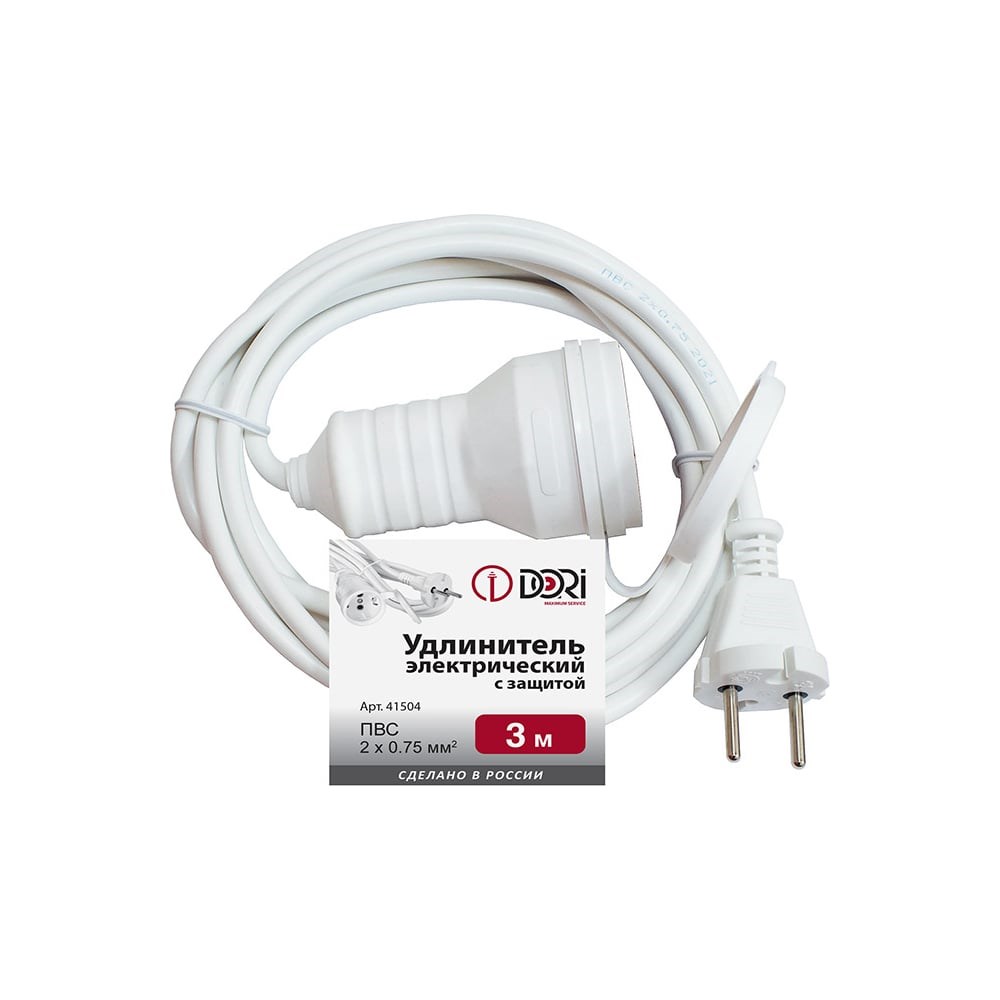 Удлинитель DORI электрический 3 м, ПВС 2x0,75 мм2, IP44, с защитой от влаги 41504 предназначен для увеличения длины кабеля и подключения к электрической сети различных приборов в условиях повышенной влажности.
