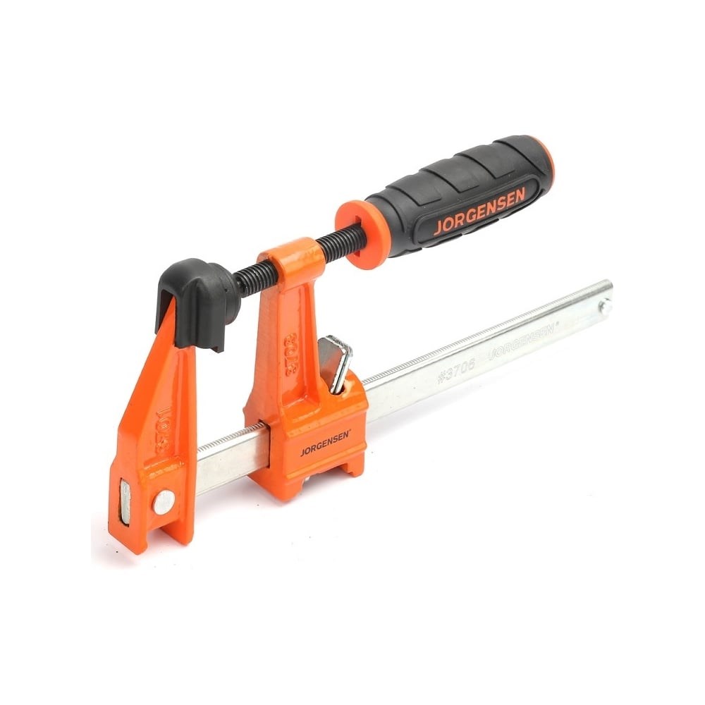 Струбцина F-образная Pony Jorgensen имеет чугунные стационарные и раздвижные головки с оранжевым порошковым покрытием, объединены с высокоуглеродистым стальным стержнем, устойчивым к коррозии, который обладает колоссальной прочностью на растяжение 5 624 кг на квадратный см. Быстродействующая скользящая головка имеет резьбу для установки винта из холоднотянутой стали с большой удобной ручкой и поворотной накладкой. Оригинальная конструкция многодискового сцепления Jorgensen позволяет скользящей головке надежно удерживаться в любой точке штанги.