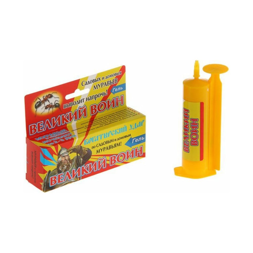 Гель против садовых и домашних муравьев Ваше Хозяйство Великий Воин 45 г, шприц-дозатор 4620015694412 используется для уничтожения садовых и домашних муравьев. Специальный состав препарата так привлекателен для насекомых, что рабочие особи не только охотно поедают ее сами, но приносят в муравейник и кормят личинок. Благодаря этому уже через несколько дней погибает вся муравьиная колония. Способ применения: Для борьбы с муравьями на садовом участке разместите точки или полоски геля на стволах деревьев, также нанесите гель на листы картона, которые разместите на муравьиных «тропах» и вокруг муравейника. Для уничтожения муравьёв, заползающих на нижние этажи домов и дачных домиков, гель наносят по периметру помещения пунктирной линией: 2 см геля, 6 см необработанной поверхности. Для лучшего эффекта рекомендуется обработать гелем помещения как по внутреннему периметру, так и снаружи. Постарайтесь предотвратить попадание на гель влаги и пыли. Повторная обработка рекомендуется в случае смыва геля и при появлении новой колонии муравьёв, но не ранее чем через 3 недели, так как состав сохраняет своё действие до 1 месяца вне помещения и до 2 месяцев внутри помещения.