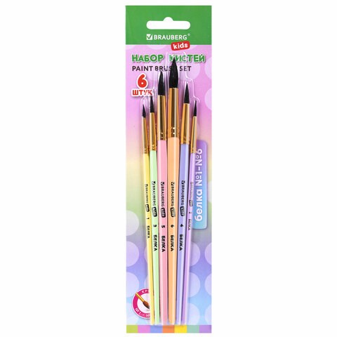 Кисти БЕЛКА набор 6 шт. (круглые № 1, 2, 3, 4, 5, 6), блистер, BRAUBERG KIDS, 201083