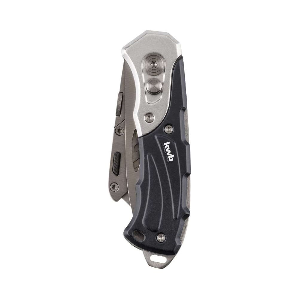 Комбинированный нож kwb 16910 включает в себя складное лезвие длиной 165 мм, складной трапециевидный нож, удобный контейнер для съемных трапециевидных лезвий. Сзади металлического корпуса имеется зажим для ремня.