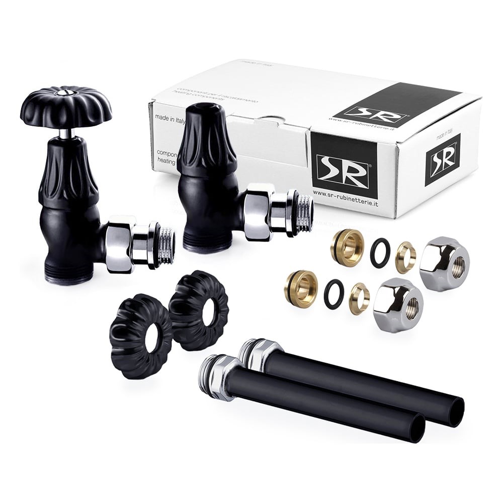 Комплект угловых вентилей SR Rubinetterie Floral Old Style 1/2” x 24/19, черный матовый A339-1500VCPS позволяет подключить чугунный дизайн радиатор в стиле Ретро максимально эстетично. Дополнительные характеристики: Диаметр подключения: 1/2“х 24-19. Рабочая среда - вода, гликолевые растворы. Максимальный процент гликоля - 30%. Максимальное рабочее давление -10 бар. Максимальная рабочая температура - 100°C. Корпус - штампованная латунь CW617N - UNI EN 12165. Гайка - штампованная латунь CW617N - UNI EN 12165. Маховик регулировки - штампованная латунь CW617N - UNI EN 12165. Внутренние механизмы - прутковая латунь CW614N - UNI EN 12164. Уплотнительные элементы -резина EPDM PEROX.