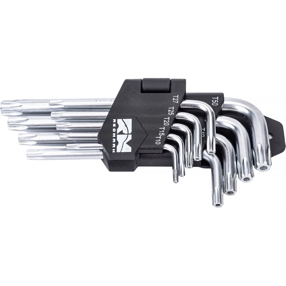 Набор шестигранных коротких ключей REDMARK Torx Т10, Т15, Т20, Т25, Т27, Т30, Т40, Т45, Т50, 9 шт. RM92202 используется для работ с крепежом в процессе ремонта и монтажа. Ключи выполнены из высококачественной стали, благодаря чему инструменты отличаются прочностью и долговечностью. Специальное покрытие исключает возникновения коррозии. Ключи поставляются в пластиковом держателе для удобства хранения.