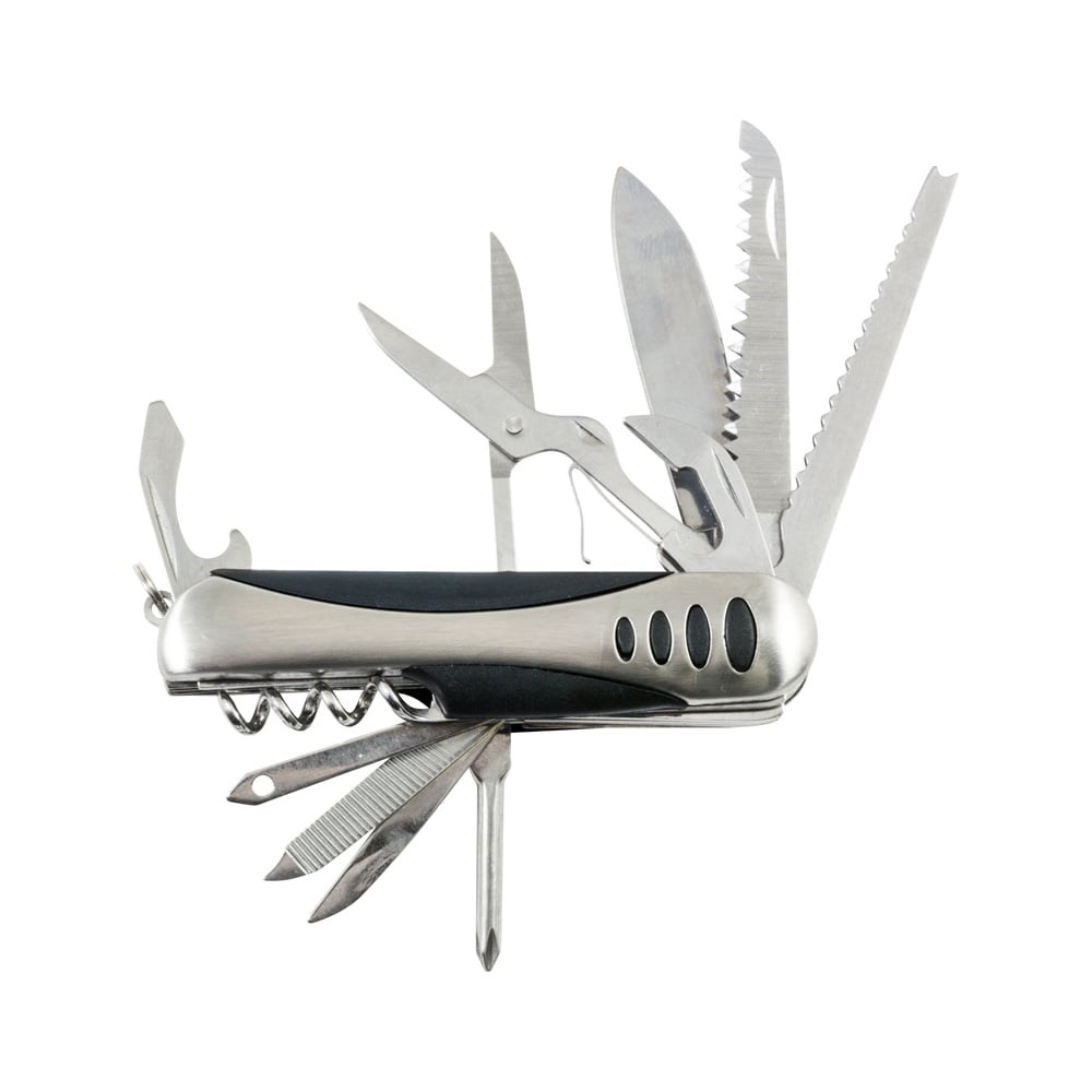 Функциинож, пила, ножницы, консервный нож, отвертка шлицевая/открывалка для бутылок, отвертка крестовая, шило, надфиль, игла для кожи, штопор