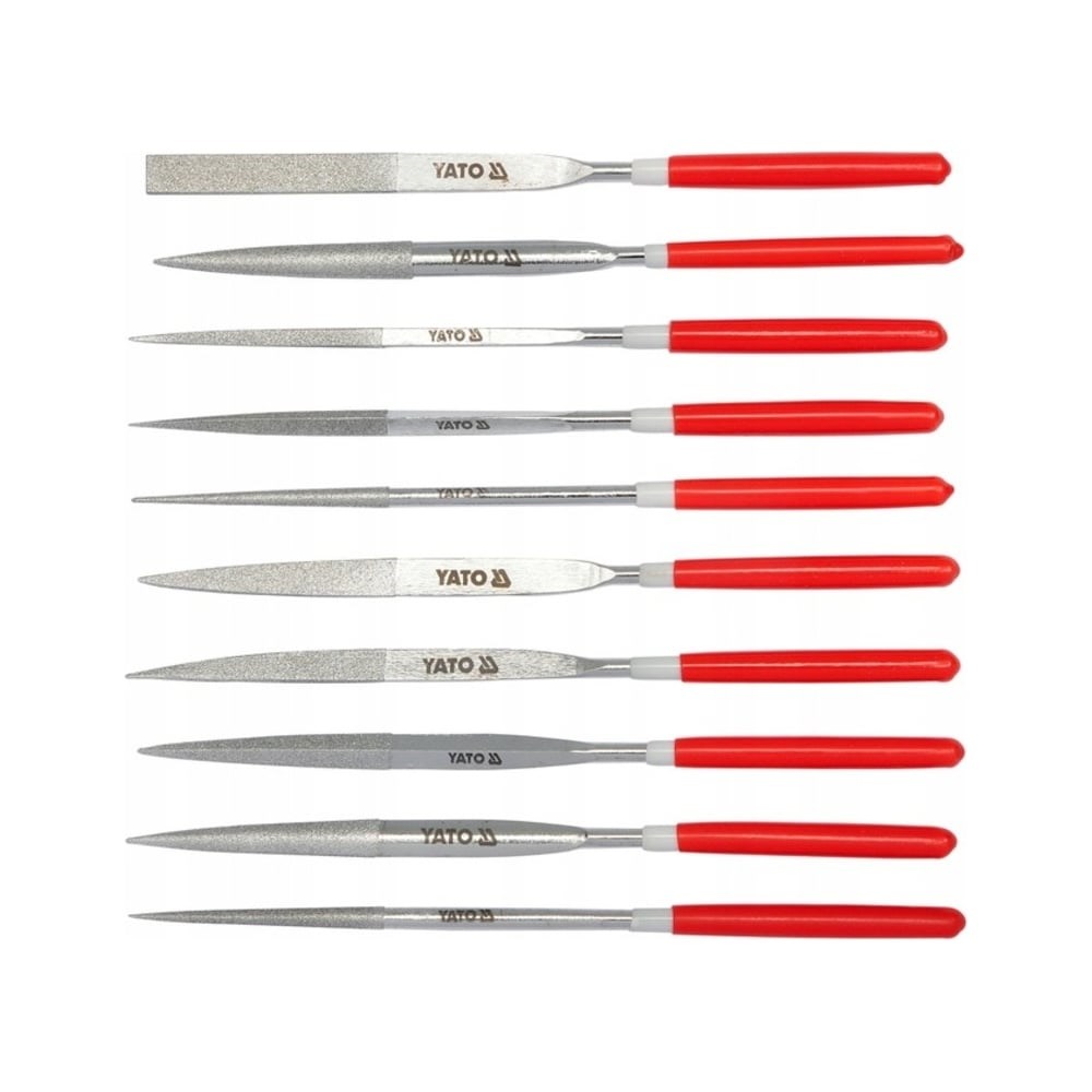 Набор алмазных надфилей YATO 4x160x50мм 10 предметов YT-6151 предназначен для выполнения мелких слесарных работ с заготовками из особо твердых материалов, таких как: металлы, керамическая плитка, стекло и прочих. Инструменты очень удобны в применении, так как оснащены пластиковыми ручками. Надфили изготовлены из высокоуглеродистой стали, профили имеют напыление из алмазной крошки.
