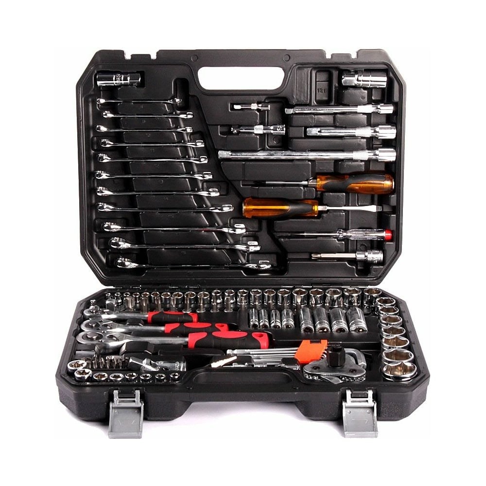 Набор автомобильного инструмента Dreamcar 121 шт. DC-000-0180185 подходит для профессионального использования в процессе ремонта неисправностей транспортных средств и других ремонтных работ. Рабочая часть всех инструментов выполнена из высокопрочной хромованадиевой и хромомолибденовой стали, что обеспечивает высокую прочность и долговечность инструмента. Рукоятки трещоток выполнены из полиэтилена ПНД высокой плотности, используемого в производстве пищевых ёмкостей и детских игрушек. Материал имеет приятную бархатистую поверхность на ощупь и минимальные выделения вредных веществ. Применение в производстве сырья высокого качества обуславливает прочность, стойкость к механическому воздействию (в том числе - ударам), долговечность и экологическую безопасность инструментов.