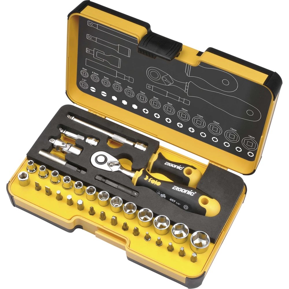 Набор бит Felo ERGONIC SL/ND/PH/Tx/SQ/BH/MS с трещоткой и рукояткой в кейсе, 36 шт 05783656 представлен в оптимальной комплектации с популярным размерным рядом. Данная модель имеет широкий набор бит и головок для разного типа работ с резьбовыми соединениями. Инструмент изготовлен из качественной стали и обладает высокой стойкостью к износу.
