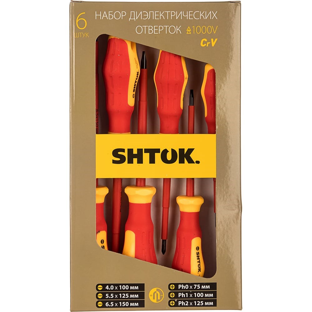 Набор диэлектрических отверток SHTOK 6 шт. картон 1000В 09906 состоит из диэлектрических отверток (три шлицевых и три крестовых). Рабочая часть отверток выполнена из хром-ванадиевой стали, оснащена магнитным наконечником для удобства монтажа в приборах, расположенных вертикально. Набор поставляется в картонной упаковке.