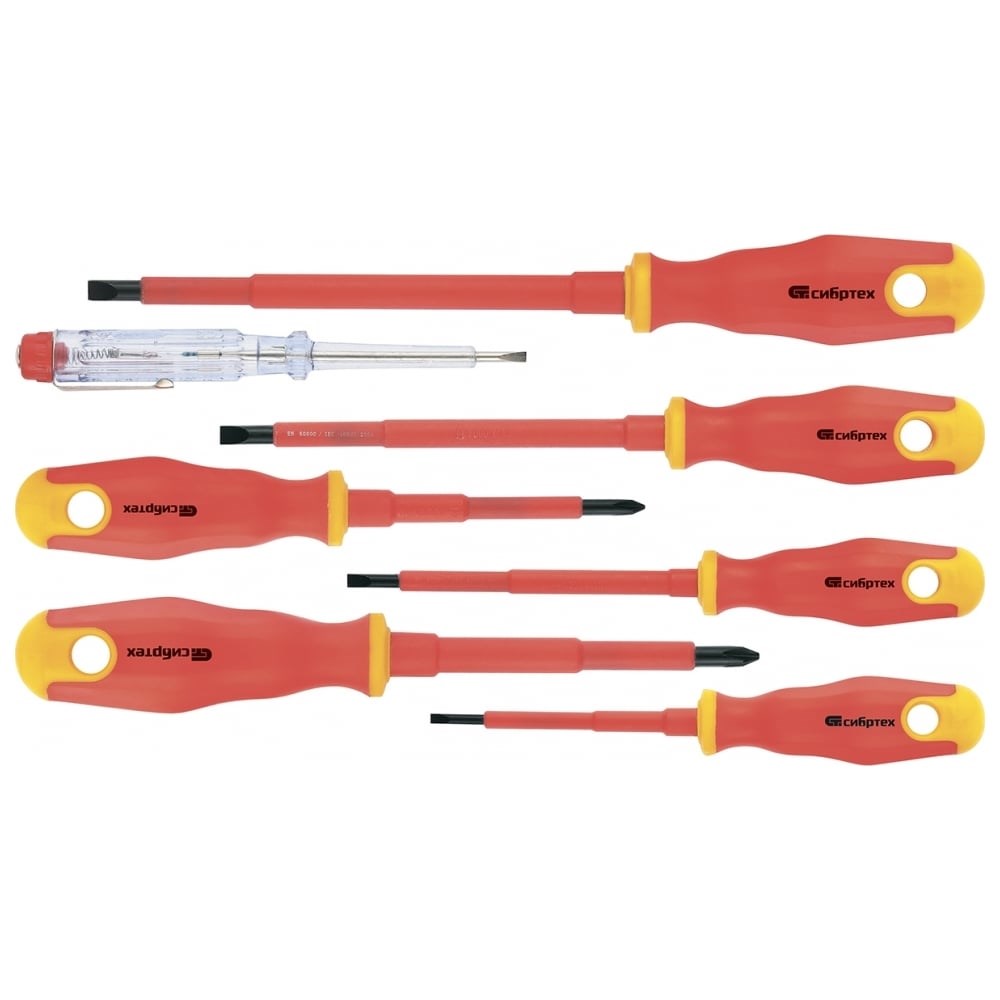 Набор диэлектрических отверток до 1000В СИБРТЕХ 7шт 12936 обладает диэлектрическим покрытием стержня, что позволяет использовать инструмент с крепежными соединениями, находящимися под напряжением до 1000 В. Стержень изготовлен из хромованадиевой стали. В комплекте поставляются отвертки с прямым и крестовым шлицами, а также индикаторная отвертка для определения напряжения в сети. Рукоятки изготовлены из двухкомпонентного материала.