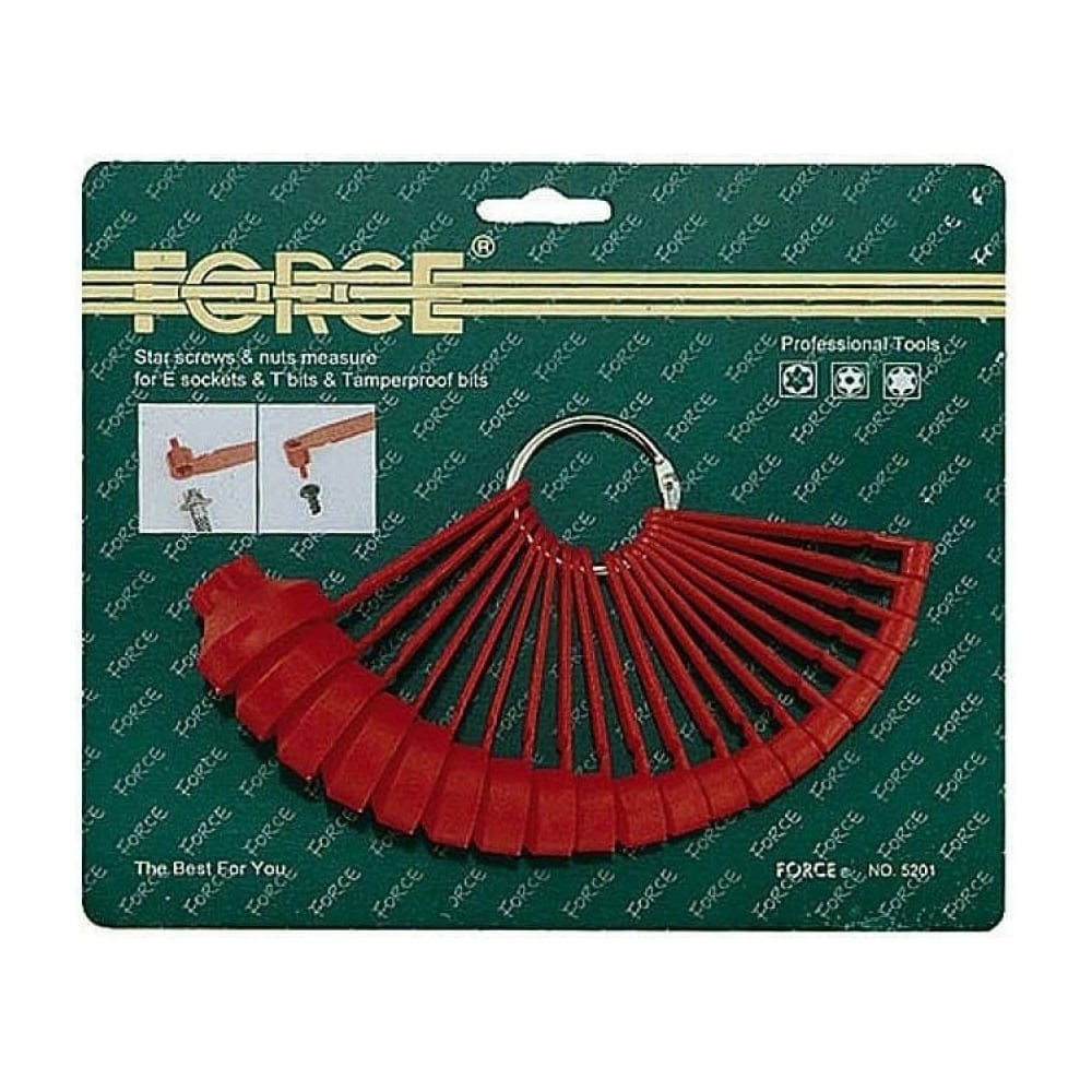 Набор для измерения размеров звёздочек FORCE 5201 представляет собой комплект шаблонов, которые можно использовать для определения внешних и внутренних шлицов в виде 6 лучевых звездочек. Шаблоны TORX (внешние) - для измерения внутренних шлицов Torx (T5-T80) и для определения размера необходимой отвертки или биты. Шаблоны STAR (внутренние) - для измерения внешних гаек Е-стандарта (E1-Е32) и для определения размера необходимой головки или накидного гаечного ключа