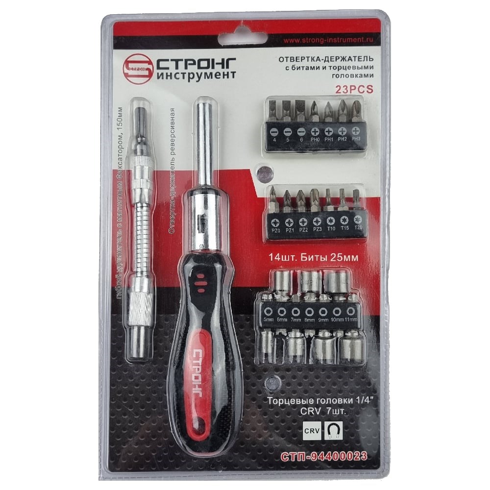Набор головок и бит с реверсивно-рычажной отверткой Strong 23 предмета СТП-94400023 имеет большой ресурс, обеспечивает высокое качество выполнения работ при монтаже и демонтаже резьбовых соединений.