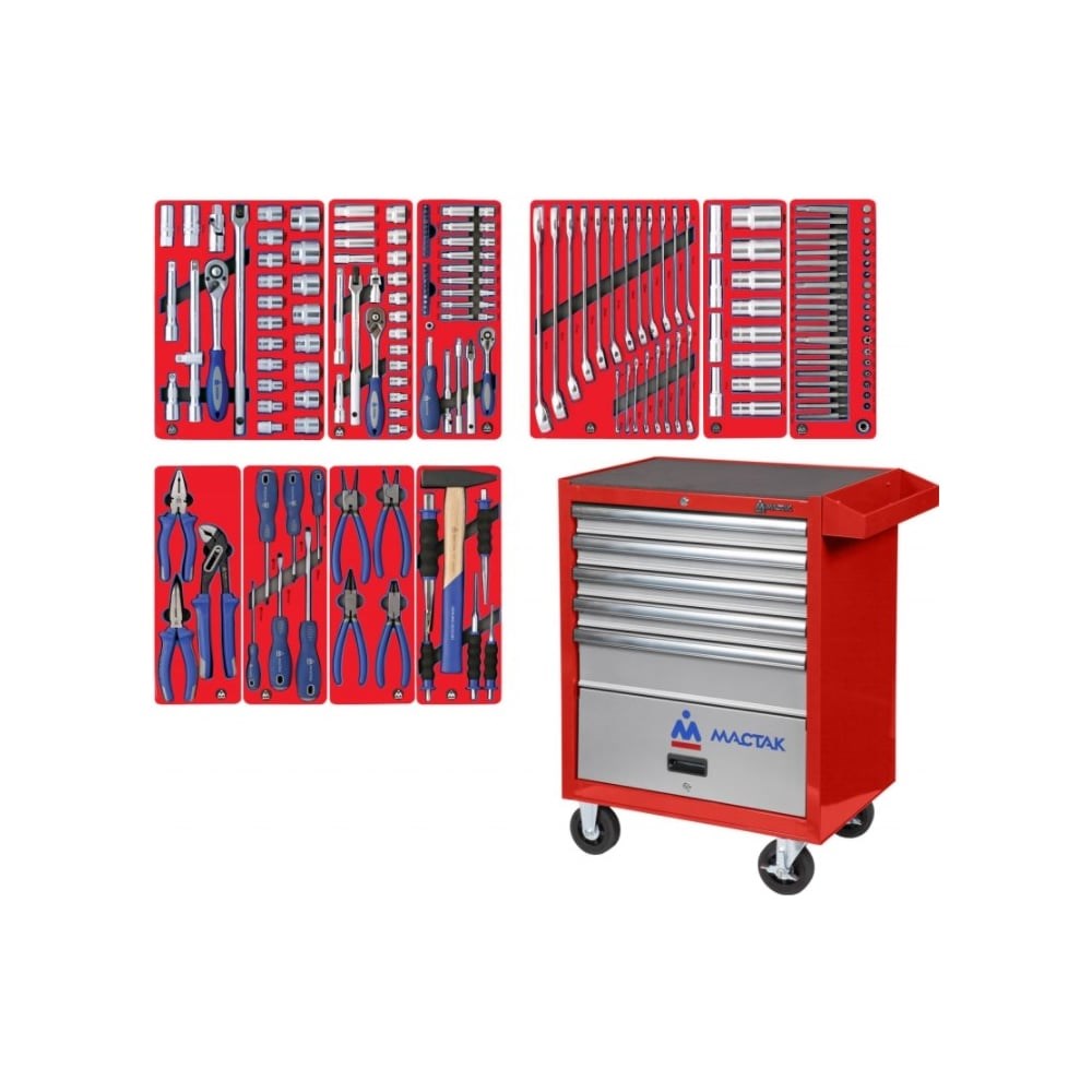 Набор инструментов СТАНДАРТ 186 предметов МАСТАК 52-05186R в красной тележке состоит из основного оборудования, которое можно использовать при проведении ремонтных работ в автомастерской. В комплект входит губчатый, ударно-режущий инструмент, наборы головок и ключей. Все распределено по отдельным ложементам, что существенно упрощает хранение и поиск оборудования. Тележка проста в управлении, обладает надежной и жесткой конструкцией, оснащена центральным замком для надежного хранения содержимого. Поворотные колеса обеспечивают хорошую управляемость в любых условиях. Размеры: Полка 1-4: 580 х 406 х 75; Полка 5: 580 х 406 х 150; Отсек для хранения: 580 х 406 х 225.