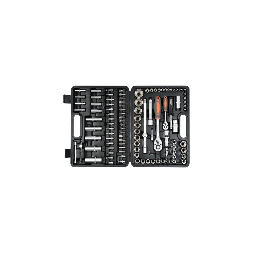 Набор инструментов STHOR 1/2 108 предметов пластиковый кейс 58685 включает в себя большое количество головок и бит, что упрощает работу с крепежом в автомобиле или в различных конструкциях. Комплект оснащен большим количеством вспомогательного инструмента, что упрощает работу с заглубленным или тугим крепежом, а также винтами с ограниченным доступом.