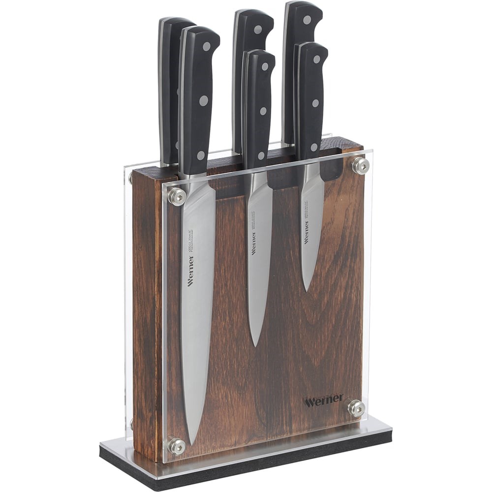 Набор ножей Werner Infinity на подставке 51948 6 предметов: нож поварской 34 см (лезвие 20 см), нож разделочный 33 см (лезвие 20 см), нож сантоку 31 см (лезвие 18 см), нож для нарезки хлеба 33 см (лезвие 20 см), нож универсальный 24 см (лезвие 13 см), нож для овощей 20 см (лезвие 9 см). Стальное лезвие сохраняет остроту длительное время. Ножи не впитывают и не оставляют запаха, не окисляют и не разрушают витамины в нарезаемом продукте. Ручка удобной формы изготовлена из пластика. Ножи в стильной подставке из дерева ясеня с магнитом внутри. Дизайн подставки задуман так, чтобы было удобно пользоваться ножами: ножи надежно удерживаются, каждый нож на виду. Подставка покрыта защитной пропиткой, подчеркивающей благородную структуру дерева, защищена вставками из оргстекла с двух сторон. Набор кухонных ножей на подставке Werner Infinity – это стильный дизайн и комфорт на вашей кухне. В составе самые необходимые ножи для ежедневного использования. Ими комфортно резать, измельчать, шинковать, разделывать, крошить и рубить мягкие, рыхлые и твердые продукты. Набор упакован в фирменную коробку. Рекомендации по использованию и уходу: Мойте ножи сразу же после использования. Рекомендуется мыть ножи вручную. Не оставляйте ножи в воде надолго. Вытирайте ножи насухо сразу после мытья. Храните ножи в специальной подставке, футляре или ящике отдельно от других приборов. При нарезании используйте деревянные или пластиковые разделочные доски. * Время от времени ножи требуют затачивания.