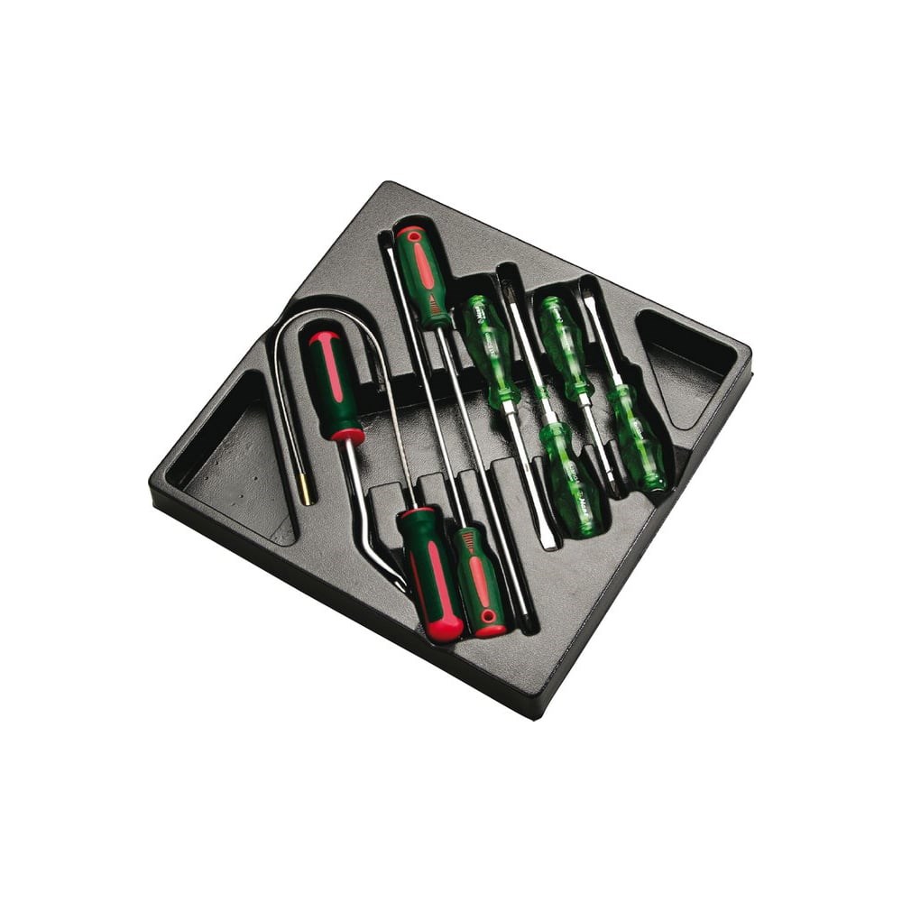 Набор отверток Hans ложемент 8шт TT-28 имеет в комплекте магнитный захват и съемник пистонов. Стержни инструментов изготовлены из прочной стали. Рукоятки выполнены из пластика и двухкомпонентного материала. Комплект служит для монтажа и демонтажа резьбовых соединений. Ложемент облегчает хранение и транспортировку.
