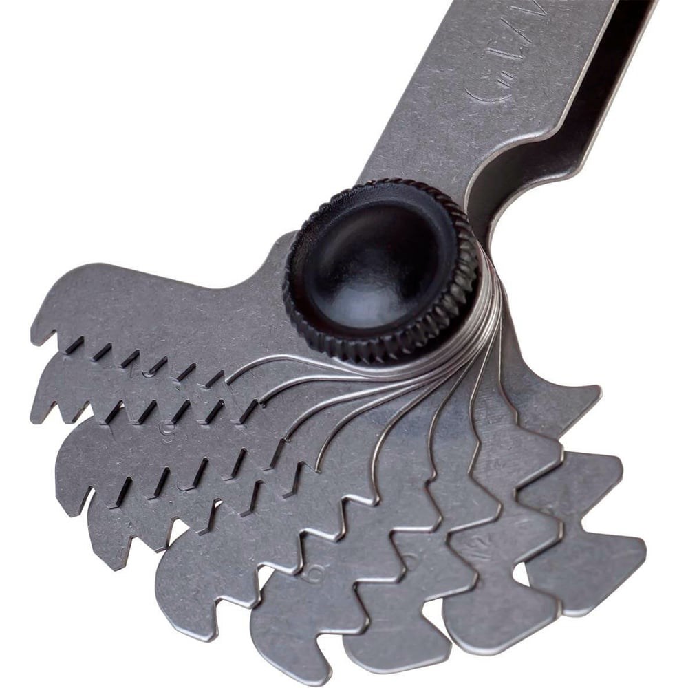 Набор резьбовых шаблонов Debever Machining Solutions 55 град DB-S-TM55 используется для определения номинального шага дюймовой резьбы с углом 55°. Представляет собой набор эталонных пластин с зубьями, каждая из которых соответствует определенному шагу резьбы. Для удобства работы данный набор оснащен винтами, позволяющими фиксировать нужную пластину.
