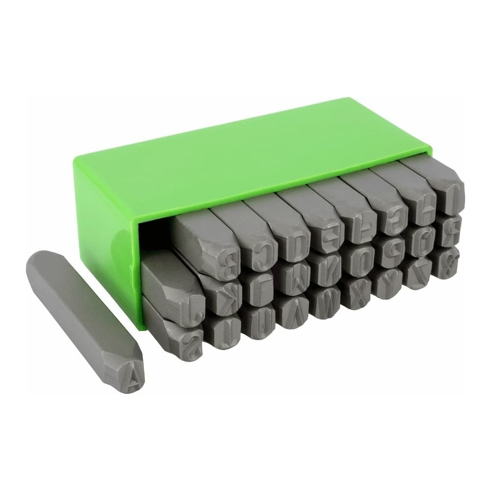 Набор стальных буквенных клейм BERIL 553008 латиница, 8 мм 14449 предназначен для нанесения цифровой маркировки на пластичные материалы. Клейма изготовлены методом фрезерования из хромованадиевой инструментальной стали и закалены до твёрдости 58-62 HRC, благодаря чему отличаются высокой прочностью и надежностью. Изделия защищены от коррозии методом фосфатирования. Набор состоит из двадцати семи клейм с буквами латинского алфавита. Изделия поставляются в пластиковом футляре для удобства хранения.
