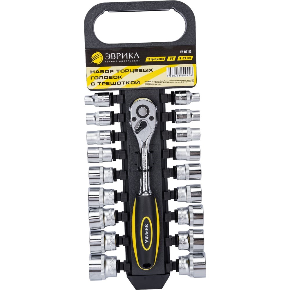 Набор торцевых головок с трещоткой ЭВРИКА 3/8 DR 6-24мм 19 предметов ER-96110 подойдет для работы с различным крепежом. Инструмент укомплектован всем необходимым, что позволяет эффективно монтировать и демонтировать болты и гайки.