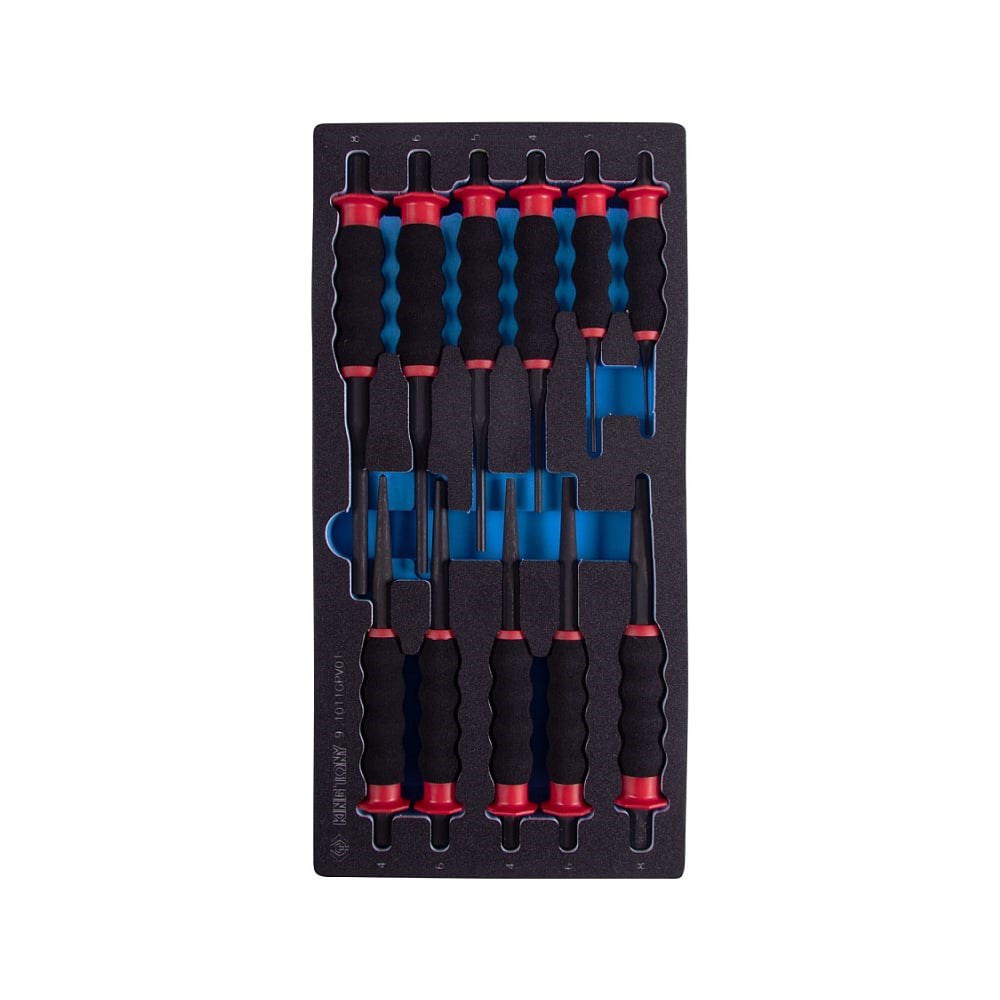 Набор выколоток, бородков и кернеров KING TONY ложемент, 11 предметов 9-1011GPV01 используется для слесарных работ при обработке штифтов и шплинтов. Инструмент выполнен из кованой стали с добавлением молибдена, что придает высокую прочность и долговечность. Фосфатированное защитное покрытие препятствует возникновению коррозии. Защитная рукоятка из пластика и пористой резины обеспечивает комфортную эксплуатацию. Ложемент из материала EVA обладает легкостью, прочностью, эластичностью и упругостью, высокими амортизирующими свойствами, устойчивостью к маслам и растворителям. При деформации материал возвращает прежнюю форму. Размер ложемента адаптирован для размещения на полке инструментальной тележки.