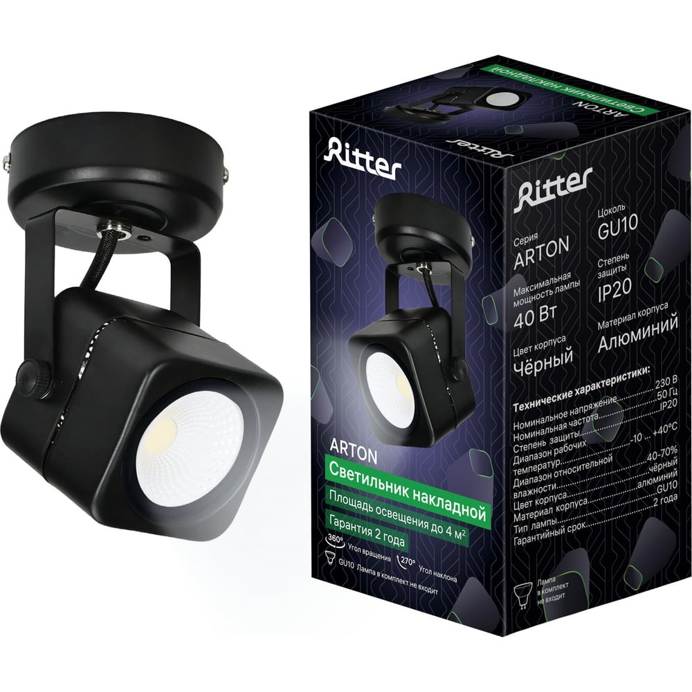Накладной поворотный светильник RITTER Arton квадрат 60x60x60 GU10 металл черный 59961 6 предназначен для акцентного освещения интерьера. В светильнике предусмотрена одна лампочка с цоколем GU10, максимальной мощностью 40 Вт. Светильник просто монтируется и надежно фиксируется. Спот можно использовать в качестве настенного светильника вместо традиционных бра. А также вешать как потолочный светильник. Строгие геометрические формы точечного светильника позволяют использовать потолочную лампу как в классических, так и в современных дизайнерских интерьерах. Встраиваемые светильники часто располагают в гостиных, коридорах, спальнях и детских в качестве дополнительного источника света. А в небольших помещениях встраиваемый спот может являться основным источником освещения. Свечение лампы распределяется ярко и равномерно, что позволяет получить больше света от одной лампочки. Используйте квадратный светильник вместе с люстрой или как самостоятельный источник освещения.Лампа комплект не входит.