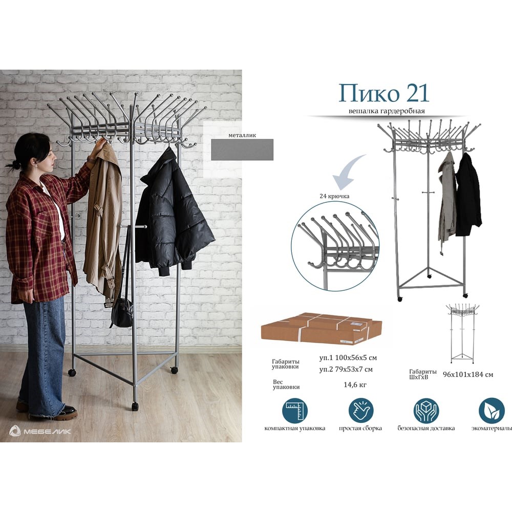 Общественная вешалка - мобильный гардероб. Идеально подходит для небольших офисов. Гардероб рассчитан на 24 посетителя с размещением одежды, головных уборов, сумок, зонтов. Возможно исполльзовать вешалки-плечики. Идеально размещается в углу помещения и не занимает места, возможно использовать номерки. Конструкция обеспечивает устойчивость при максимальной нагрузке. Вешалка легко собирается без помощника, компактно упакована.Материалы: стальная труба d25 мм., колес. опорыУПАКОВКА: 100х56х5 см, 79х53х7 см, 2 места