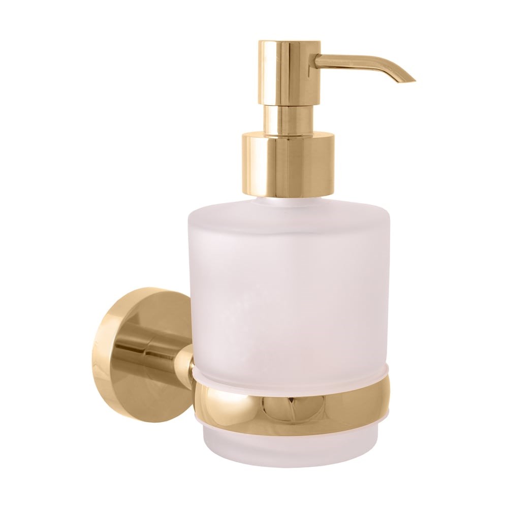 Дозатор для жидкого мыла стеклянный, ЦВЕТ ЗОЛОТО, арт. COA0303Z. Стильный предмет интерьера, предназначенный для ванной комнаты. Устанавливается на стену. Материал, применяемый для производства аксессуара - латунь/стекло. Практичная и в то же время продуманная вещь, выполненная в стиле модерн.