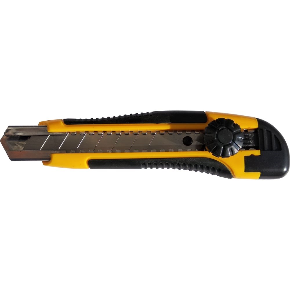 Нож с выдвижным и обламываемым лезвием ФТ 18мм 730000 предназначен для резания мягких материалов, таких как картон, кожа, утеплители, изоляция проводов. Нож имеет выдвижное обламывающееся лезвие и два запасных. Благодаря обламывающимся сегментам кончик лезвия остаётся всегда острым без заточки. Для безопасного обламывания сегментов на обратной стороне ножа есть пластиковая вставка. Фиксатор лезвия с резьбой позволяет надёжно зафиксировать лезвие и исключает самопроизвольное его складывание. Длина обламывающихся сегментов - 10 мм. Всего на лезвии 8 сегментов. Рукоятка оснащена резиновой накладкой.