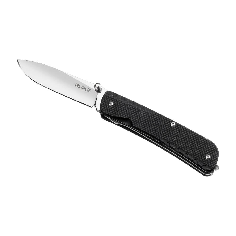 Нож Ruike multi-functional черный LD11-B отлично приспособлен для поездок с этим инструментом на природу. Он имеет небольшой размер и легкий вес, поэтому его удобно брать с собой, не займет много места. Все инструменты изготовлены из нержавеющей стали, устойчивой к механическим повреждениям. На рукоятка имеется рельефная накатка, благодаря которой нож не будет скользить в руке. Дополнительные характеристики Твердость закалки металла достигает 58-59 HRC Лезвие целиком сделано гладко заточенным Длина клинка от кончика до рукоятки составляет 85 мм Толщина по обуху не превышает 3 мм Шлифовка лезвия сделана зеркальной Длина ручки ножа – 114 мм В торе рукоятки встроен стеклобой Полная длина открытого складного ножа – 199 мм