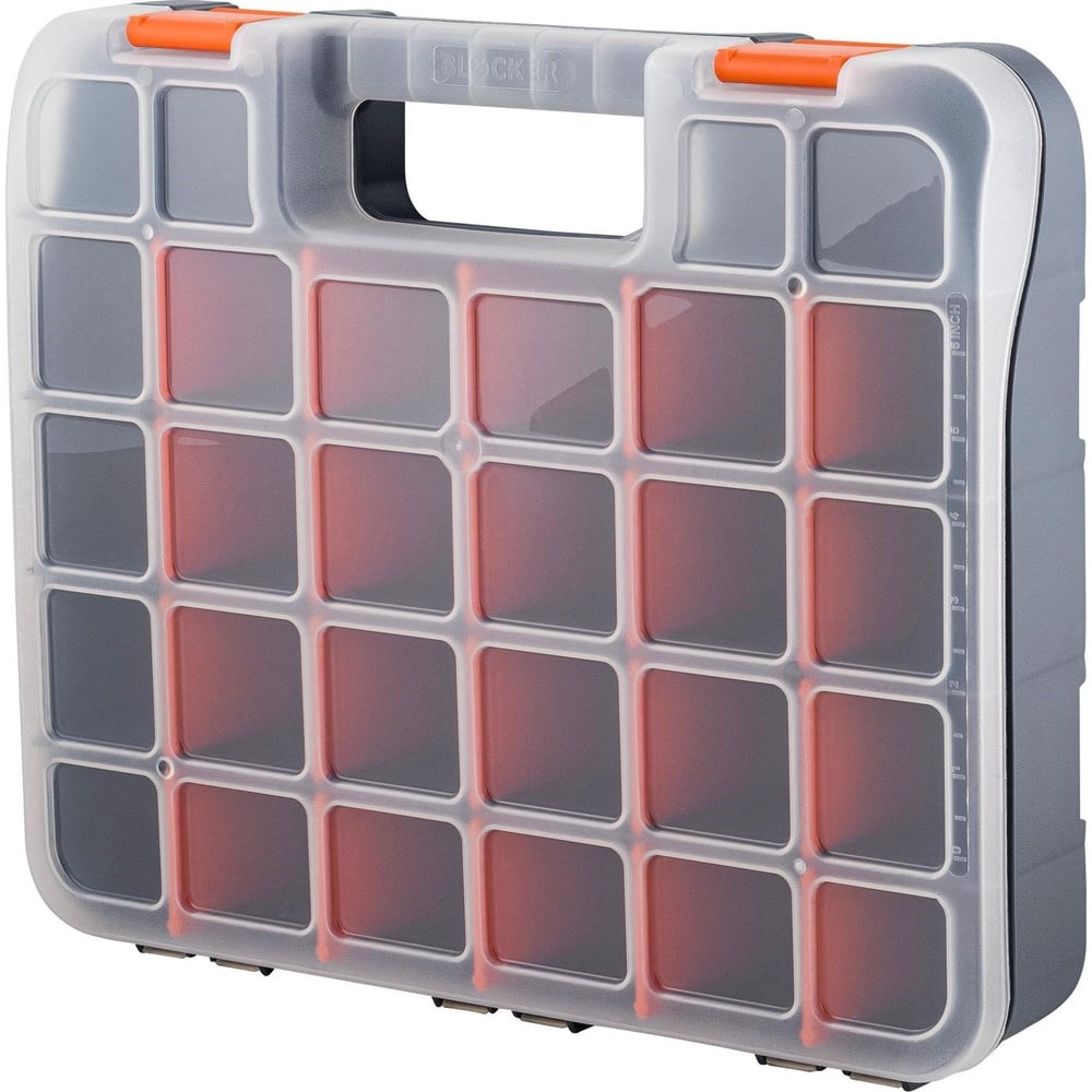 Органайзер п/п 382х322х74 односторонний, для мелочей цв. серо-свинцовый/оранжевый Blocker 33745 - для мелочей помогает содержать в порядке, переносить на место выполнения работ и быстро находить метизы и аксессуары. Идеален для использования дома, на даче, в гараже, мастерской, в автомобиле. Внутреннее деление на отсеки делает удобным размещение внутри органайзера деталей, которые необходимо отделить друг от друга. Съёмные перегородки позволяют изменять размер отсеков под личные нужды. Прозрачная крышка позволяет увидеть содержимое, не открывая органайзер. На крышке имеются линейки для быстрого поиска метизов необходимого размера. Удобная ручка упрощает перенос органайзера на место выполнения работ. Органайзеры одного размера скрепляются спинами, позволяя создавать двухсторонний органайзер. Благодаря плотно прилегающей крышке, исключающей смешивание содержимого, органайзер подходит для хранения самых мелких деталей, в том числе для рыболовных и швейных принадлежностей, коллекционирования, занятия хобби.