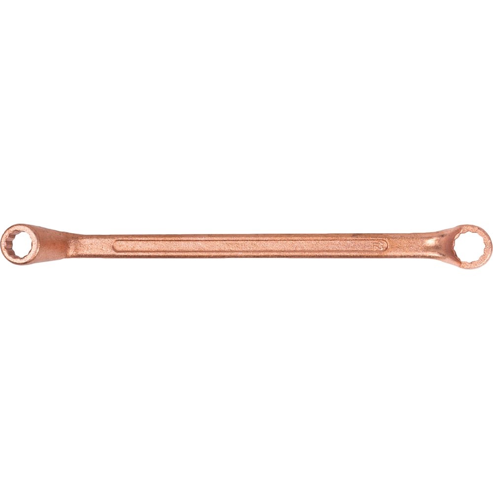 Двусторонний накидной ключ предназначен для работ с резьбовыми соединениями в процессе ремонтных и монтажных работ. Инструмент выполнен из высококачественной стали, благодаря чему отличается прочностью и долговечностью. Омедненное покрытие обладает повышенной устойчивостью к высокотемпературному воздействию случайной искры. Ключ может применяться на предприятиях с наличием потенциально опасных сред, а также в быту.