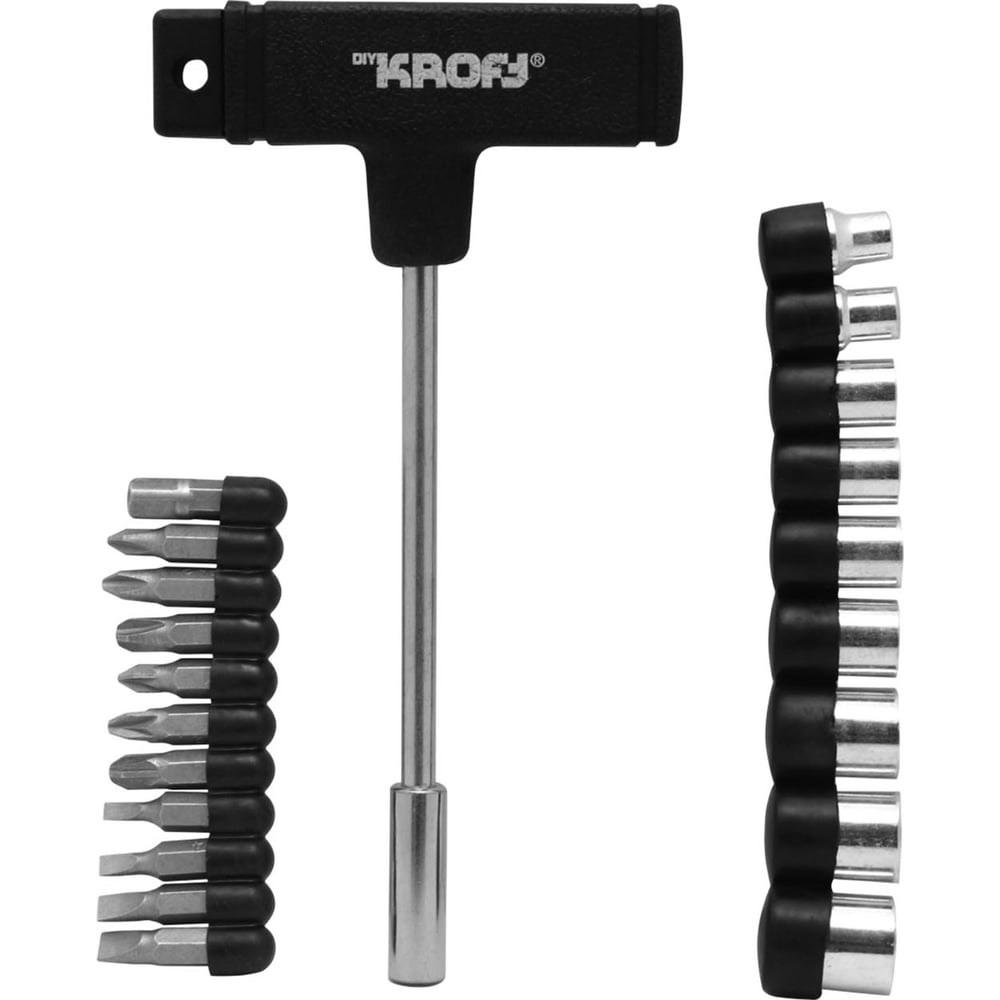 Набор головок и бит 21 шт KROFT Набор состоит из бит 25 мм с шестигранным хвостовиком1/4'' HEХ,торцевых головок высотой 20 мм со стандартным рабочим профилем 1/4, адаптером и Т-образной рукояткой. Набор охватывает наиболее полный и востребованный комплект бит и головок, применяемых в быту. T-образная рукоятка позволяет снизить нагрузку на ладонь, в то время как адаптер для бит делает замену и установку быстрой и легкой для пользователя. Специальные пластиковые держатели позволяют удобно хранить головки и биты. Шестигранный хвостовик 1/4'' бит и переходника для торцевых головок позволяет их использовать не только с ручным инструментом, но и электроинструментом рассчитанным на хвостовик типа HEX.Все инструменты изготовлены из высокопрочной инструментальной стали CS которая обладает отличными свойствами, такими как жесткость, прочность, устойчивость к износу и коррозии. Это делает набор пригодным как в бытовом, так и в профессиональном использовании. Характеристики:Длина биты (мм): 25Тип хвостовика: 1/4'' HEXДлина головки (мм): 20Рабочий профиль: 1/4Материал: инструментальная сталь (CS)Количество предметов в упаковке (шт): 21Состав набора:Рукоятка для бит (Т-образная) х 1 шт,Адаптер х 1 шт,Торцевая головка (1/4") х 9 шт: 5, 6, 7, 8, 9, 10, 11, 12, 13 мм,Бита (25 мм) х 10 шт: PH1 (4.5/4 мм), PH2 (6 мм), PH3 (8 мм), PZ1 (4.5/4 мм), PZ2 (6 мм), PZ3 (8 мм), SL3, SL4, SL5, SL6