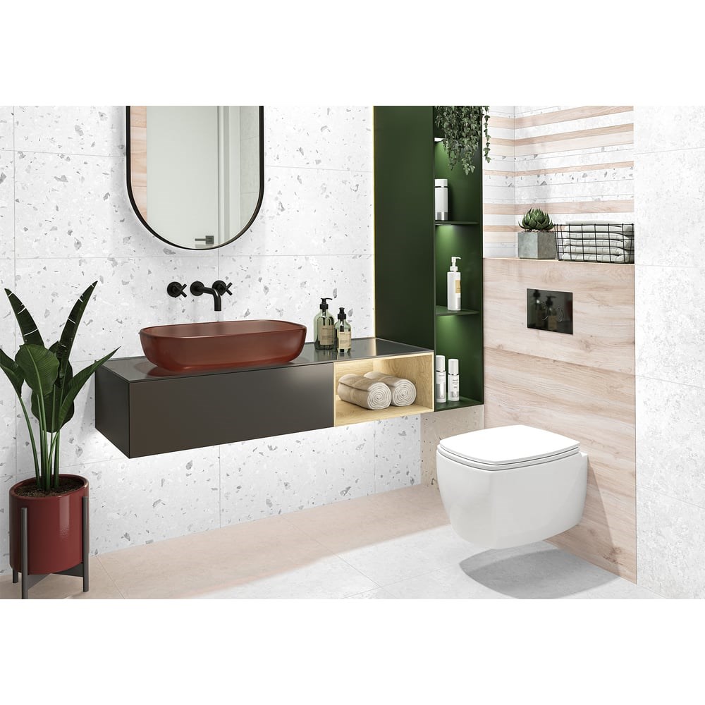 Коллекция Play с глянцевой поверхностью рекомендована для облицовки стен ванной комнаты и санузла. Современная коллекция - это сочетание терраццо, бетона и дерева. Такой микс текстур для тех, кто не боится экспериментировать. Глянцевая поверхность плиток дополнена спецэффектом матовых чернил, которые создают на поверхности сатиновую текстуру и объём. За счет этого бетонно-каменная поверхность получается сложной с интересным сочетанием глянцевой и матовой поверхности. Плитка с текстурой древесины нюдовых оттенков является мягким акцентом коллекции. Декоративный массив полоски из всех видов текстур коллекции поможет правильно распределить акценты в пространстве, не перегружая его.