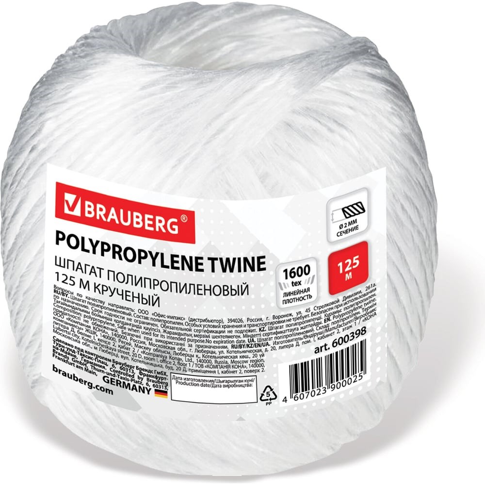Шпагат полипропиленовый, длина 125 м, диаметр 2 мм, линейная плотность 1600 текс BRAUBERG 600398 используется для упаковки товаров. Изделие не подвержено воздействию щелочей, кислот, органических растворителей, отличается надежностью и износоустойчивостью.