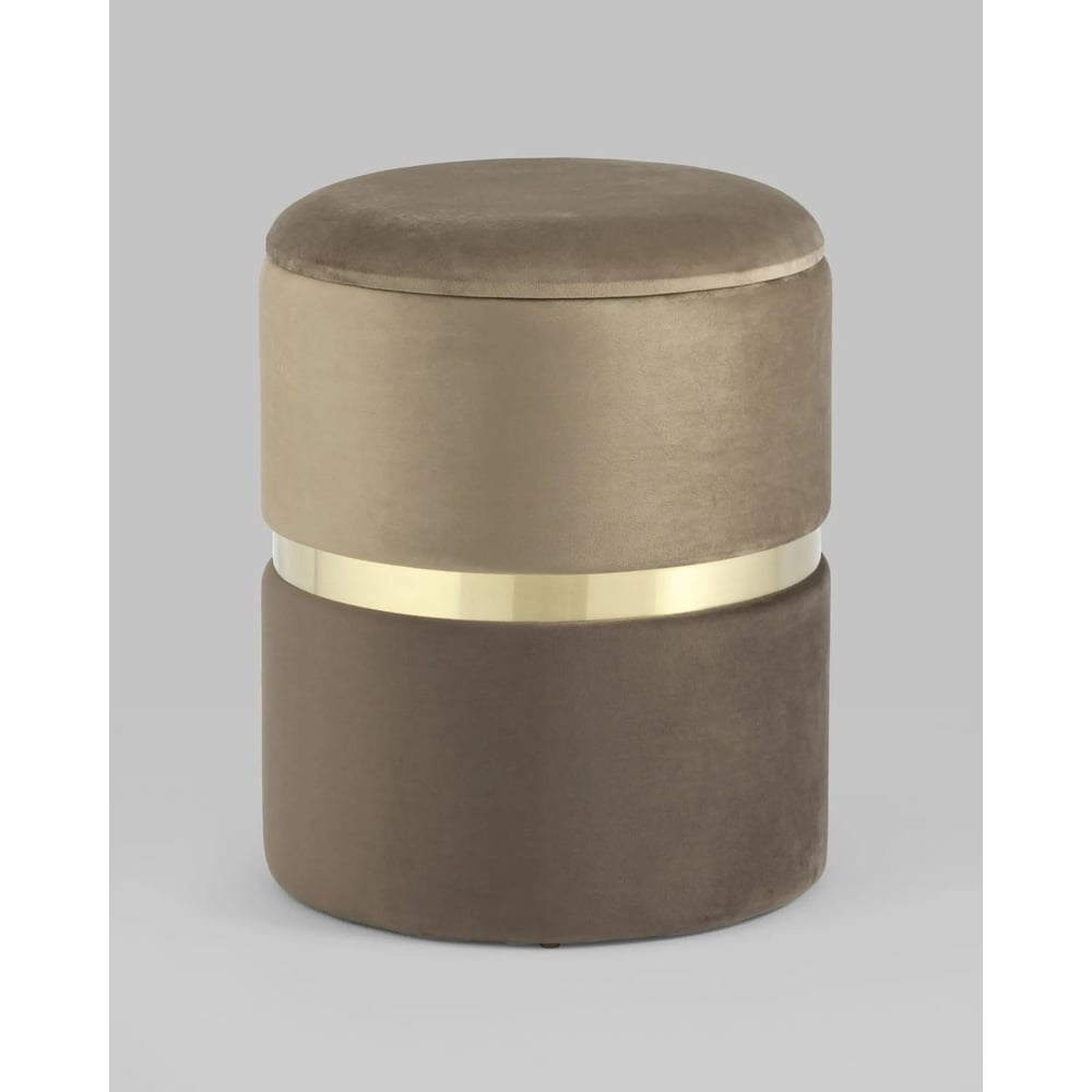Лаконичная модель пуфа в мягкой обивке прекрасно впишется в современные интерьеры. Обивка выполнена из велюра в светлом и темном оттенках и украшена металлическим ободком в золотом цвете. Под сиденьем имеется ящик для хранения различных мелочей. В основании предусмотрены специальные подпятники, которые делают пуф более устойчивым и предотвращают скольжение. Высота пуфа: 44 см. Диаметр: 36 см.