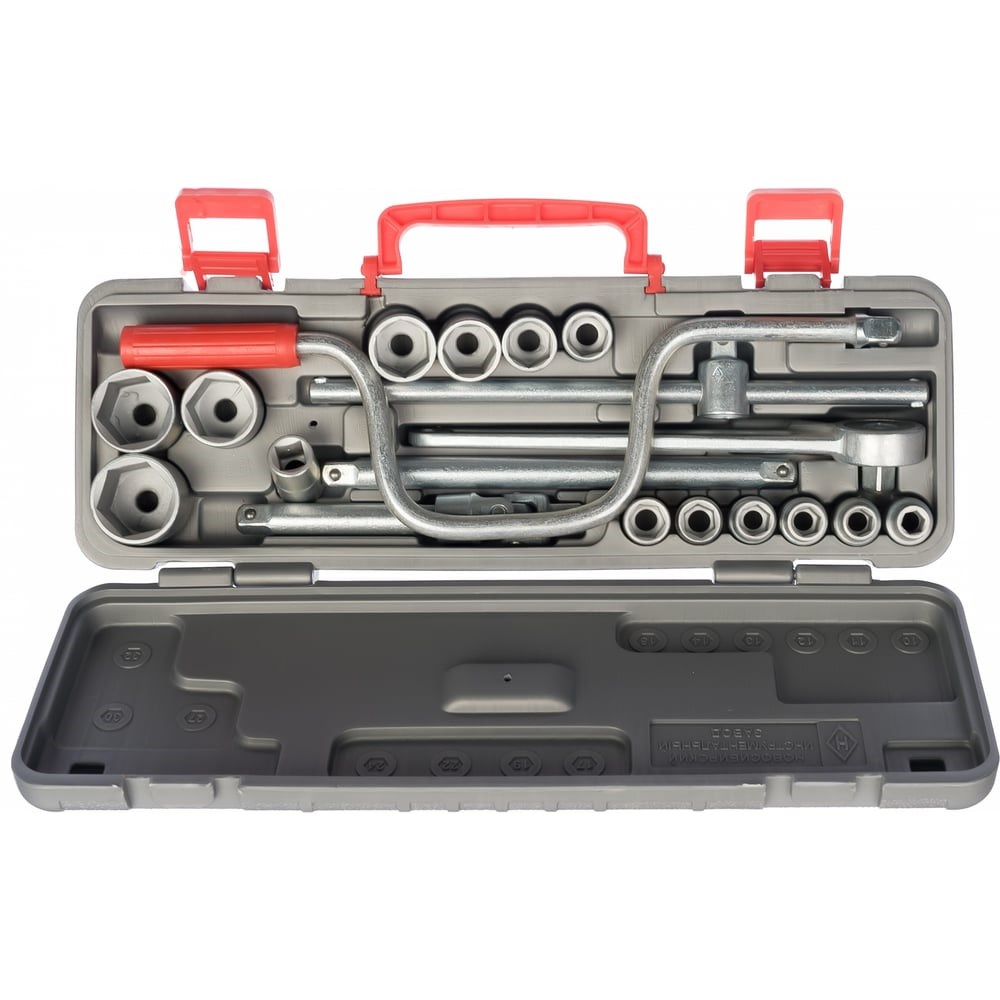 Набор шоферского инструмента в пластиковом кейсе НИЗ № 3 2761-30 состоит из 19 предметов: 13 сменных головок с присоединительным квадратом 1/2" (12.5 мм), два ключа, два удлинителя, коловорот и шарнир. Для удобства хранения и транспортировки набор поставляется в пластиковом кейсе размером 420х186х60 мм. Общий вес набора - 3.5 кг.