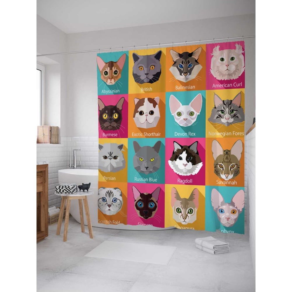 В отличие от подобных изделий из ПВХ и силикона, занавеска в ванную, пошитая из полиэстера, выгодно отличается красивым внешним видом, прочностью и длительным сроком службы. Водонепроницаемая ткань плотностью 80 г/м2 украшена стильным разноцветным принтом - нанесенная краска не боится контакта с горячей водой и не выцветает с течением времени. В комплект шторы для ванной размером 180х220 см входит 12 крючков, для которых уже подготовлены все нужные отверстия. Стиль: молодежный. Принт: Породы котов. Цвет: серый, розовый, зеленый. Рисунок: анималистический. Теги: коты, породы, цвета. При покупке нужно учесть, что фактический размер изделия может отличаться от заявленного в пределах не более 5 см.