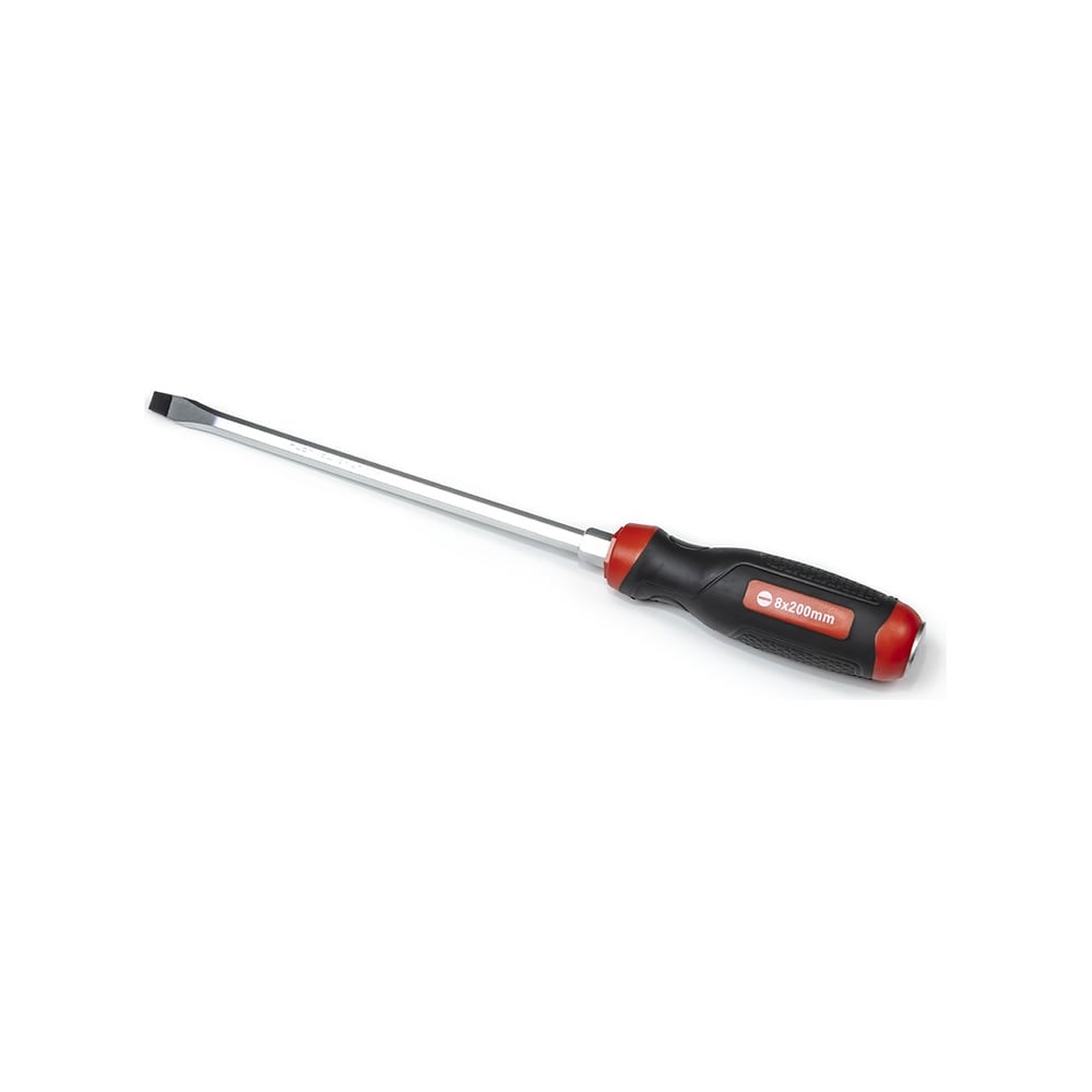 Силовая шлицевая отвертка предназначена для завинчивания/отвинчивания крепежных элементов вручную, имеющих внутренний рабочий профиль там, где требуется дополнительное усилие. Применяется на станциях технического обслуживания автомобилей, в автосервисах и автомастерских, для домашнего использования или профессиональных ремонтно-монтажных работ. Отвертка изготовлена из высококачественной легированной хромованадиевой инструментальной стали, с последующей закалкой до твердости в пределах 46-48HRC, что соответствует всем требования нормативной документации. Наконечник проходит дополнительную термическую обработку с целью получения оптимального сочетания твердости и пластичности. Сквозная посадка стержня и металлический затыльник позволяют применять ударное воздействие. Шестигранный профиль у основания рукояти позволяет посредством ключа существенно увеличить усилие, передаваемое крепежу. Отвертка снабжена двухкомпонентной эргономичной рукоятью. Благодаря высококачественным компонентам рукоять имеют высокую стойкость к агрессивным средам. Защиту от коррозии обеспечивает специальное хромоникелевое покрытие.