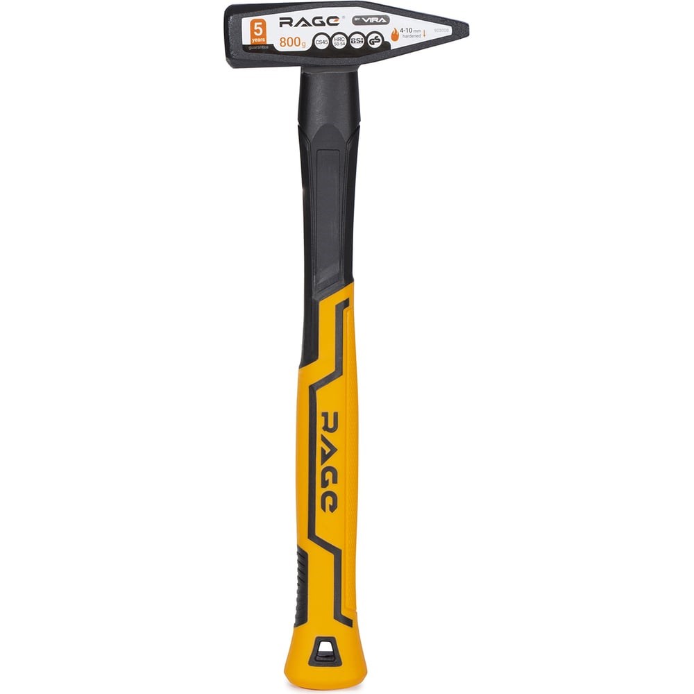 Молоток слесарный 800 гМолоток слесарный RAGE by VIRA с фиберглассовой ручкой. Слесарный молоток служит для забивания крупных и мелких гвоздей, для сборки и демонтажа конструкций из дерева, обработки металлов. Боёк выполнен из инструментальной стали CS45. Рабочая часть молотка плотно соединена с рукояткой и ощущается как её продолжение. Эти части практически невозможно разделить. Твердость бойка: 50-54 HRC. Молоток слесарный RAGE by VIRA также, соответствует немецкому стандарту DIN. Наши специалисты поработали над усилением закалки инструмента с исходных 2-6 мм до 4-10 мм. Боёк стал меньше разрушаться при ударах. Рукоятка из фибергласса прочна, но легка. При использовании многократной намотки, из этого сырья изготавливают парусные мачты, автомобильные глушители и велосипедные рамы. Фибергласс не рассыхается, не гниет, не реагирует на воздействие кислот. Ещё одно преимущество материала – его способность гасить передающиеся удары, а значит вы меньше отобьете руки работая с металлом. Покрытие из термопластичной резины TPR мягкое наощупь и не дает рукоятке скользить в ладони.Молоток предназначен для слесарных работ, обладает повышенной прочностью и износостойкостью. Рабочая часть молотка плотно соединена с рукояткой, эти части практически невозможно разделить. Рукоятка из фибергласса прочная и легкая. Фибергласс не рассыхается, не гниет, не реагирует на воздействие кислот. Покрытие рукоятки из термопластичной резины TPR мягкое на ощупь и не дает скользить в ладони.Характеристики:Длина (мм): 365Вес бойка (г): 800Общий вес (г): 1080Материал бойка: инструментальная сталь CS45Твердость (HRC): 50-54Материал рукоятки: стержень-фиберглассМатериал покрытия топорища: ABS-пластик, термопластичная резина (TPR)Применение: для забивания крупных и мелких гвоздей, сборки и демонтажа конструкций из дерева, обработки металлов