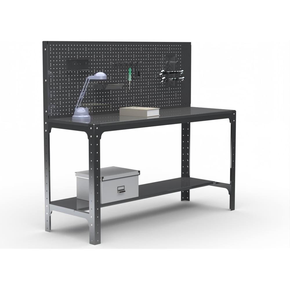 Металлический стол с одной полкой + перфопанель с комплектом аксессуаров (серый) предназначен для удобной организации рабочего места. Используется на производствах, складах, в гаражах, мастерских и других объектах. Благодаря болтовому соединению имеет возможность многократной сборки, рост разборки конструкции. Помимо столешницы имеется дополнительная нижняя полка - 1 шт. Перфопанель с комплектом аксессуаров является дополнительный элементом, который увеличивает рабочее пространство и структурирует хранение инструмента. Толщина перфопанели 0. 8 мм. Возможность легкого объединения с другими моделями столов, тумб с полками, столов с ящиками и другими изделиями серии KIT. При соединении болта с гайкой дают прочную затяжку элементов. Преимуществами данного стола являются его практичность, мобильность, прочность и долговечность в использовании. Стол выполнен из стали толщиной 1,5 мм. Полка выполнена из стали 0,8 мм. Крепление: болтовое. Цвет: серый. Порошковая покраска.
